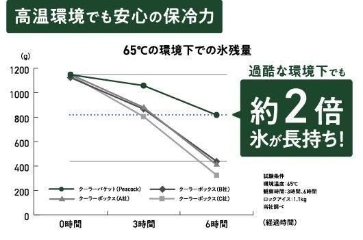 65℃の過酷な環境下(夏場の車内を想定)でも、一般的なクーラーボックスに比べ、約2倍の保冷力。